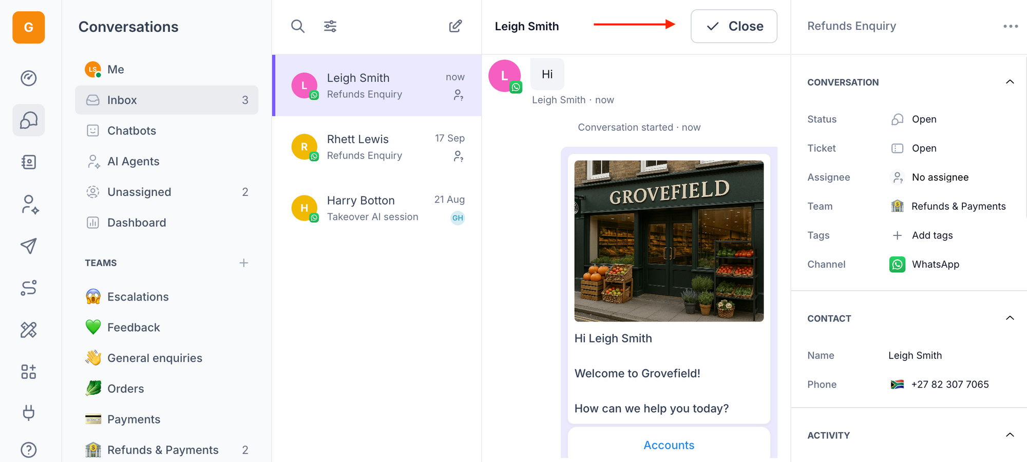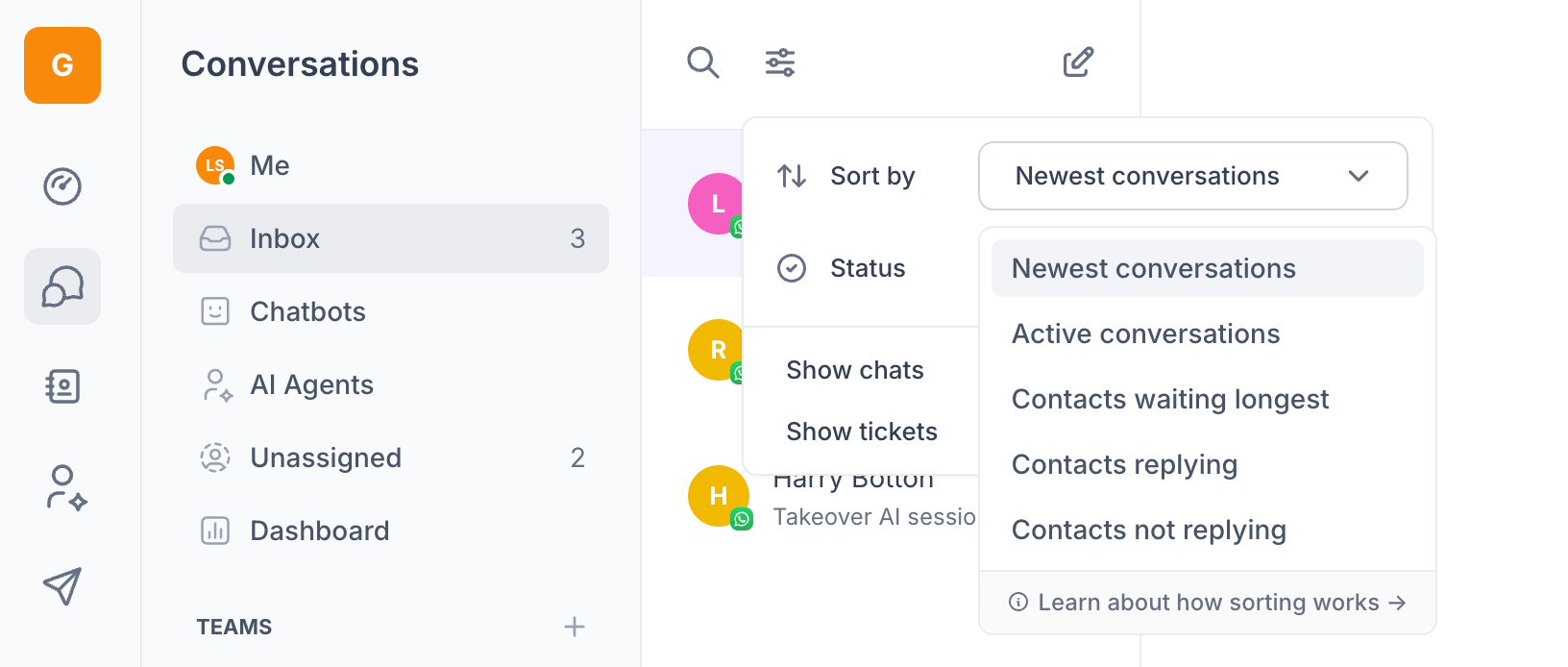 Contacts not replying: Sort conversations to show the ones where customers have stopped replying.