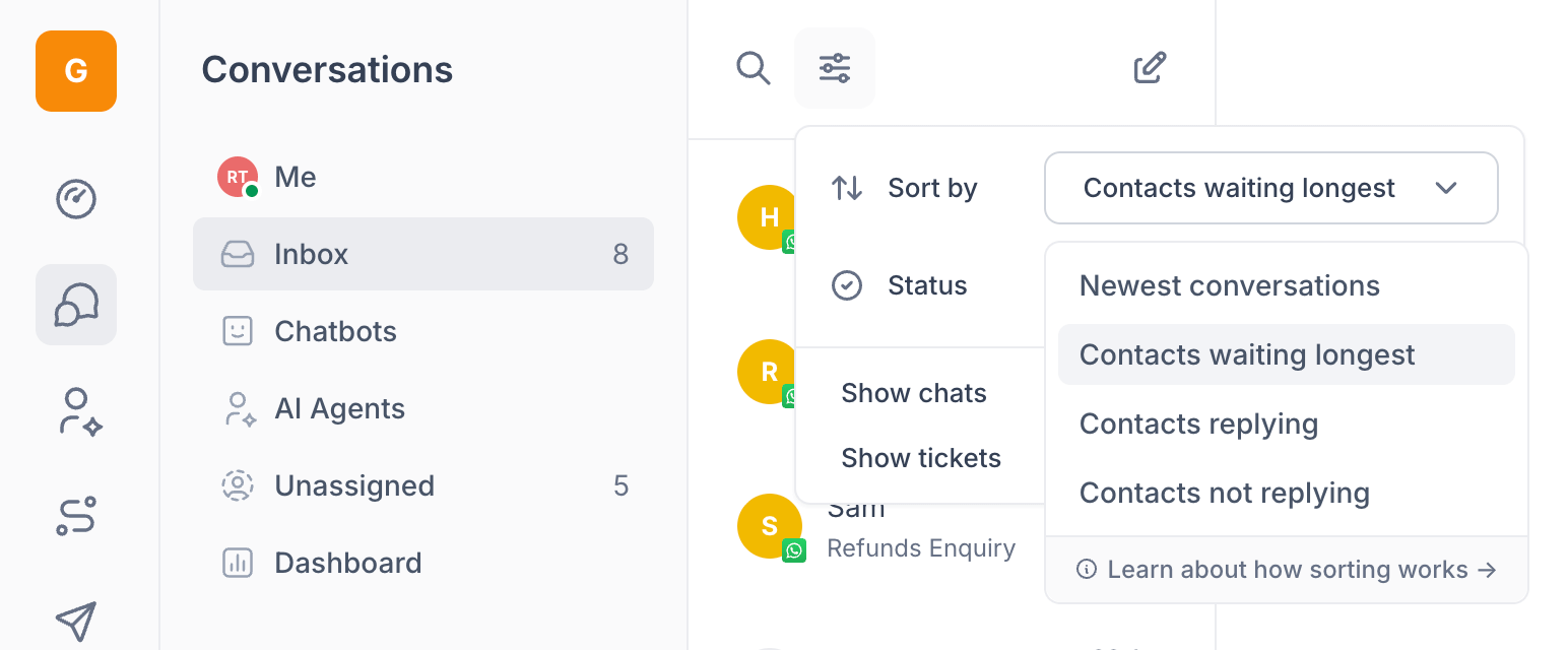 You can adjust the sorting of conversations you see in the Inbox view by clicking on the settings icon.
