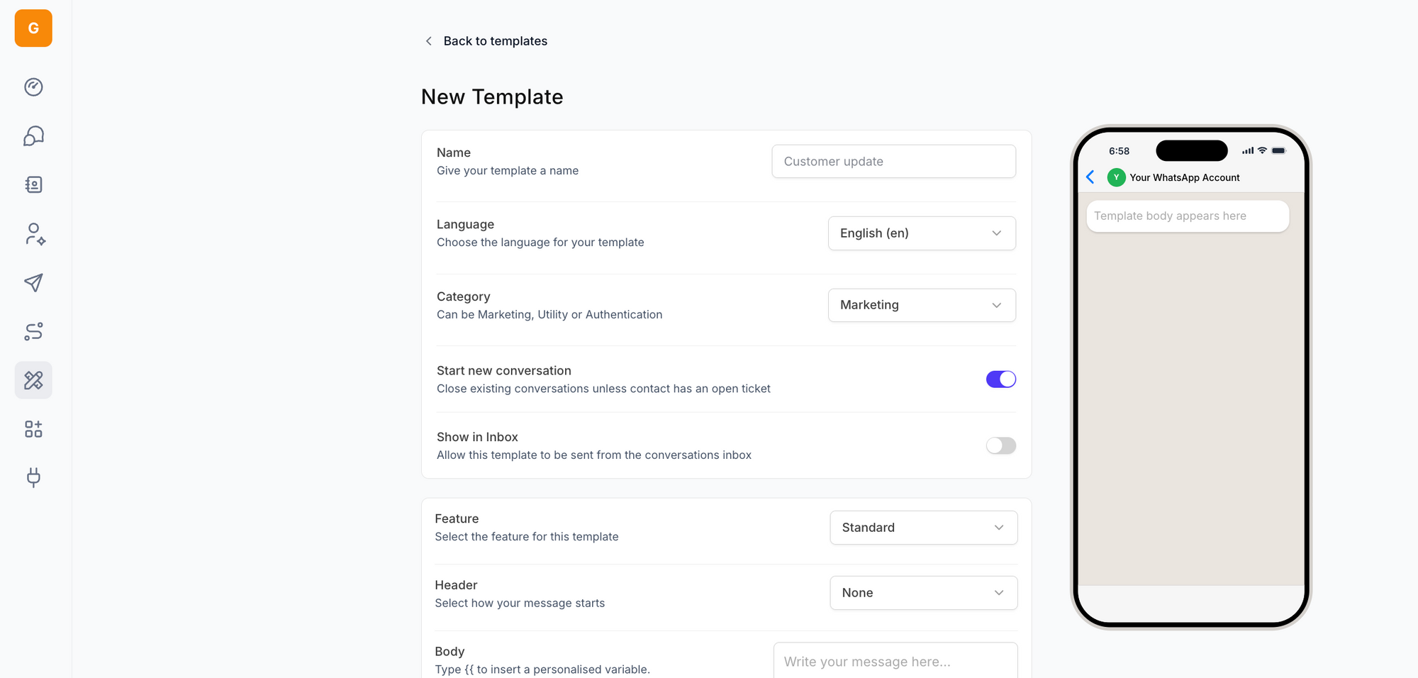 - Show in Inbox: Makes the template available for use in the Inbox. Allows you to, in an open conversation, click 'Send a WhatsApp Template' which opens the template selection modal, or using the template to initiate a new single-send conversation.