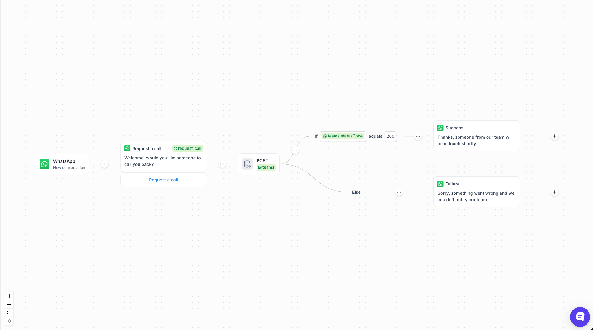 Next, we'll setup a simple Cue chatbot flow where someone on WhatsApp can "Request a call" and a notification gets pushed through to Teams as a channel message.