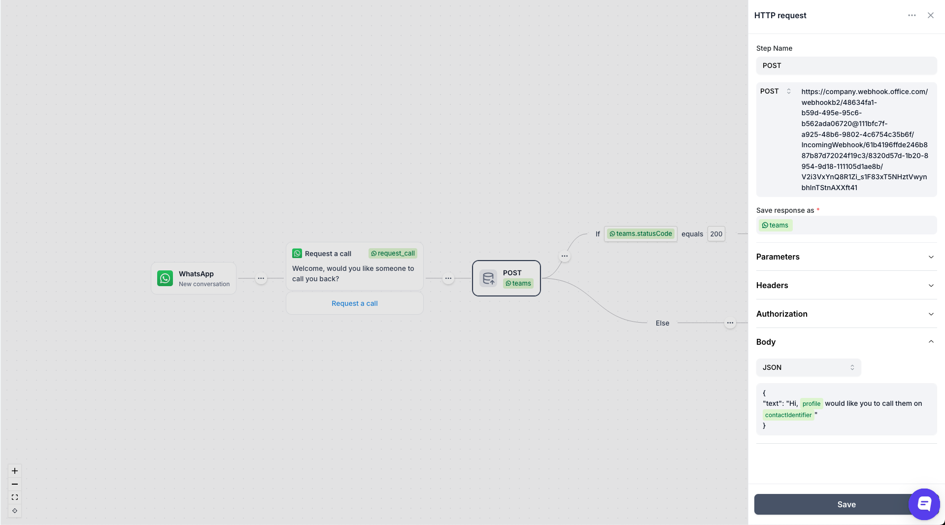 Make sure the JSON body you are creating in this request step matches the same shape that your Teams Workflow expects. In this case, your JSON body should include a text